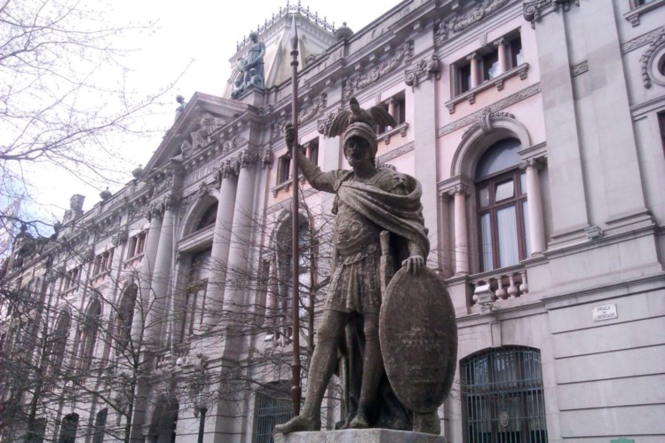 | Estátua "O Porto", guerreiro com capacete encimado por um dragão, idealizada pelo escultor João de Sousa Alão e esculpida pela mestre pedreiro João da Silva. |